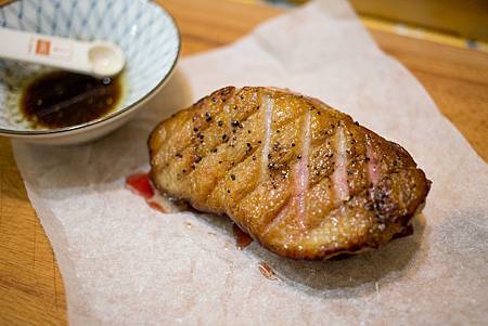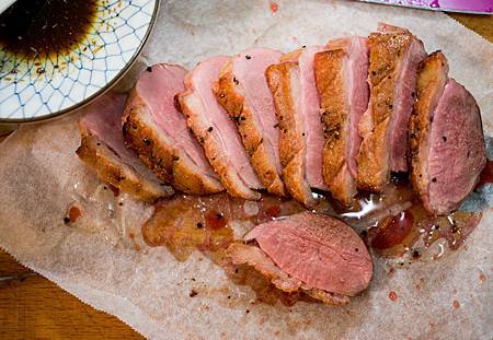 噹啷~切片後的成品~肉大約七八分熟,用烤的熟度很均勻,但皮沒有脆脆香香的感覺。