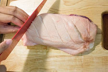 將鴨皮切斜格紋,深切但不切到肉,此舉可以幫助煸鴨油。