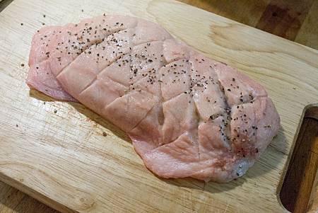 第一次切,我覺得自己切得蠻成功的,哈,接著灑點鹽巴與黑胡椒粉。